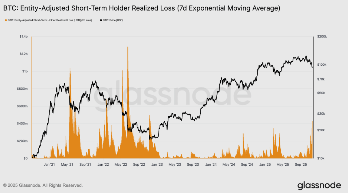 Báo cáo cũng nhấn mạnh rằng mức độ “đầu hàng” của nhà đầu tư đang gia tăng nhanh chóng, củng cố triển vọng giảm giá. Đây là lần thứ ba kể từ đầu năm 2024, BTC phá xuống dưới dải dưới của mô hình chi phí vốn STH, nhưng mức độ căng thẳng lần này lớn hơn đáng kể. EMA 7 ngày của khoản lỗ thực hiện từ nhóm STH đã tăng vọt lên 523 triệu USD mỗi ngày — mức cao nhất kể từ thời điểm FTX sụp đổ.
