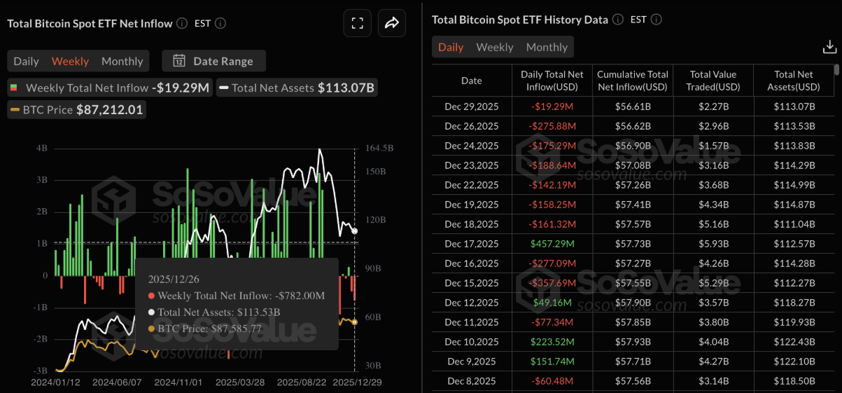 Bitcoin (BTC) đang dao động quanh ngưỡng 88.000 USD tại thời điểm viết bài vào thứ Tư, sau khi không thể vượt qua vùng cản tâm lý 90.000 USD trong phiên trước đó. Sự hậu thuẫn từ khối tổ chức tiếp tục cho thấy bức tranh phân hóa, khi các quỹ Bitcoin ETF giao ngay tại Mỹ duy trì đà rút vốn đều đặn, trái ngược với động thái Strategy âm thầm gom thêm 1.229 BTC trong tuần qua. Ở chiều ngược lại, các chỉ báo tâm lý cho thấy nhà đầu tư cá nhân vẫn đặt kỳ vọng vào một nhịp hồi phục của thị trường trong giai đoạn đầu năm mới.