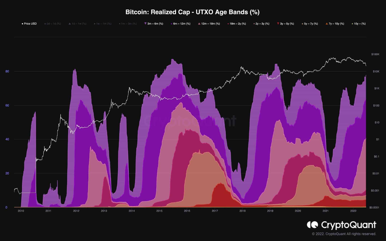 Hình bên dưới mô tả một bức tranh lớn về động lực cung của Bitcoin, dựa trên dữ liệu từ CryptoQuant. Realized Cap – UTXO Age Bands (%) là số liệu mô tả các cụm đồng coin dựa trên tuổi thọ của chúng (tính từ lần cuối cùng chúng được di chuyển) và tỷ trọng của chúng trong tổng vốn hóa thực tế (realized cap). Như đã nêu rõ trong biểu đồ, các đồng coin khác nhau về độ tuổi từ 3 tháng đến 10 năm được minh họa và phân loại bằng các màu sắc riêng biệt.