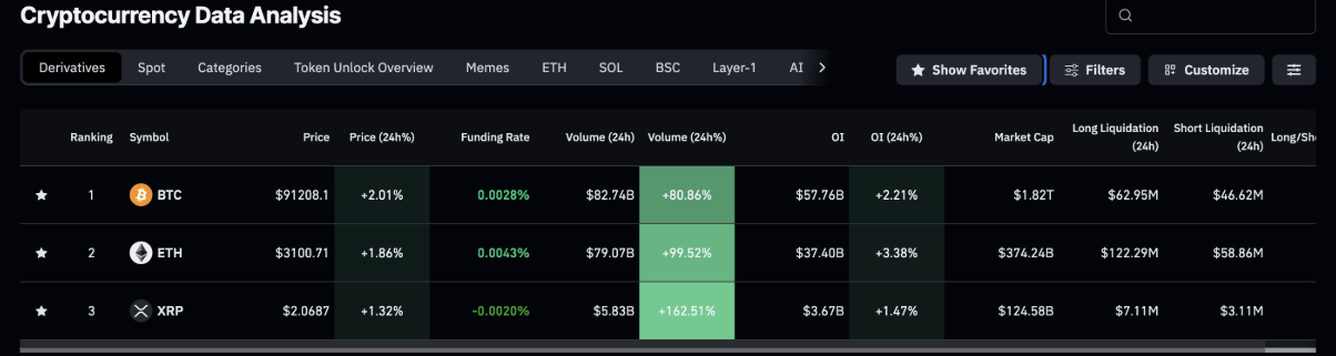Dù dòng vốn tổ chức có phần chững lại, nhu cầu từ nhà đầu tư cá nhân đối với Bitcoin, Ethereum và Ripple vẫn được duy trì ổn định. Điều này được thể hiện qua sự gia tăng của hợp đồng mở (OI) trên thị trường phái sinh, cho thấy tâm lý chấp nhận rủi ro vẫn hiện hữu. Theo dữ liệu từ CoinGlass, OI của hợp đồng tương lai BTC, ETH và XRP trong 24 giờ qua đã tăng lần lượt hơn 2%, 3% và 1%.