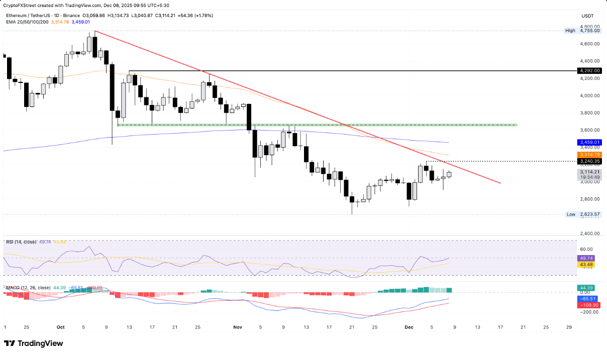 Dù vậy, rủi ro điều chỉnh vẫn hiện hữu. Nếu giá quay đầu giảm và xuyên thủng ngưỡng tâm lý 3.000 USD, đà suy yếu có thể kéo dài, kéo Ethereum lùi về vùng đáy ngày 21/11 quanh mốc 2.623 USD.