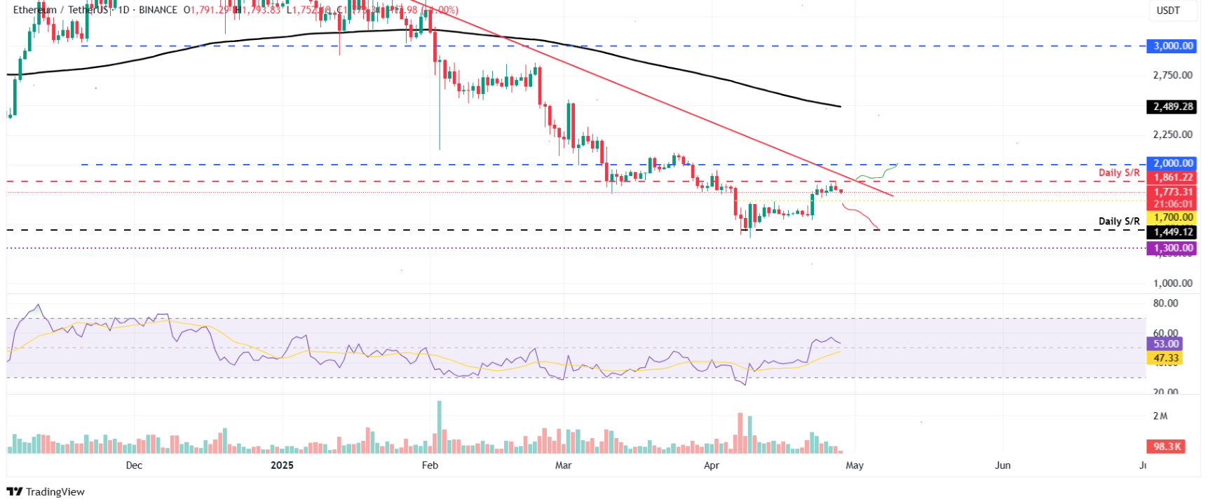 Ethereum đã bứt phá qua ngưỡng kháng cự $1.700 vào thứ Ba và ghi nhận mức tăng 14,86% tính đến thứ Bảy. Tuy nhiên, đà tăng nhanh chóng bị chững lại khi ETH kiểm tra lại vùng kháng cự hàng ngày tại $1.861 vào ngày hôm sau và chịu áp lực điều chỉnh nhẹ. Đến thời điểm viết bài vào thứ Hai, ETH đang giao dịch quanh ngưỡng $1.800.