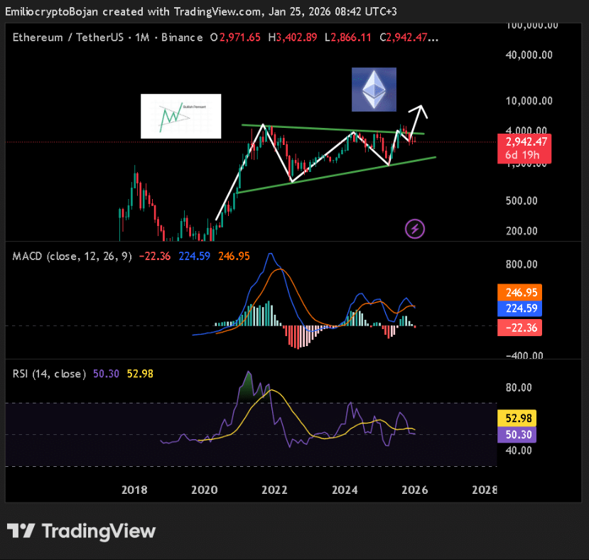 Vào ngày 26/1, Ethereum (ETH) đang tiến gần giai đoạn hoàn tất mô hình cờ đuôi nheo tăng giá trên khung thời gian tháng – một cấu trúc kỹ thuật thường gắn liền với các chu kỳ tăng trưởng dài hạn. Thiết lập này nhanh chóng thu hút sự quan tâm của giới giao dịch, đặc biệt là những nhà đầu tư tìm kiếm lợi nhuận bền vững. Trên các khung thời gian thấp hơn, khi ETH lùi về những vùng hỗ trợ then chốt, kỳ vọng về một cú bứt phá càng được củng cố.