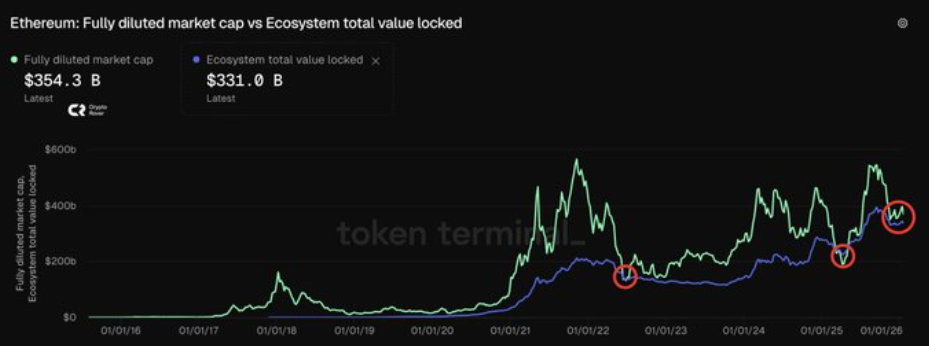 Trong quá khứ, những giai đoạn ETH giao dịch thấp hơn giá trị nội tại của hệ sinh thái thường trùng khớp với các vùng tích lũy dài hạn. Không ít lần, đây chính là bàn đạp cho những nhịp phục hồi mạnh mẽ khi thị trường dần hạ nhiệt và biến động suy giảm.