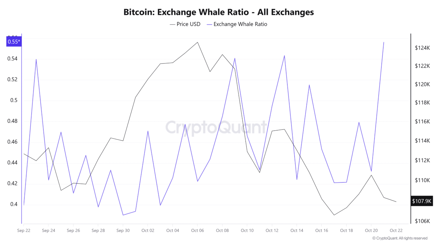 Tỷ lệ giao dịch của cá voi (Exchange Whale Ratio) đã tăng lên 0,556 – mức cao nhất trong vòng một tháng, cho thấy các nhà đầu tư lớn đang tích cực chuyển Bitcoin lên sàn.