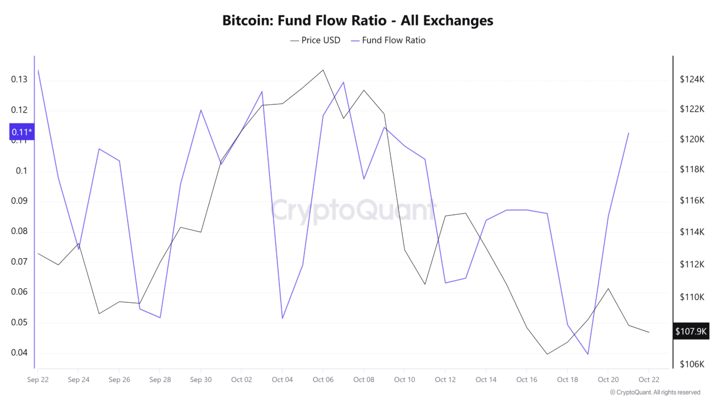 Song song đó, tỷ lệ dòng tiền quỹ Bitcoin (Fund Flow Ratio) cũng tăng lên 0,11, củng cố thêm nhận định rằng hoạt động nạp coin lên sàn đang ngày càng sôi động.