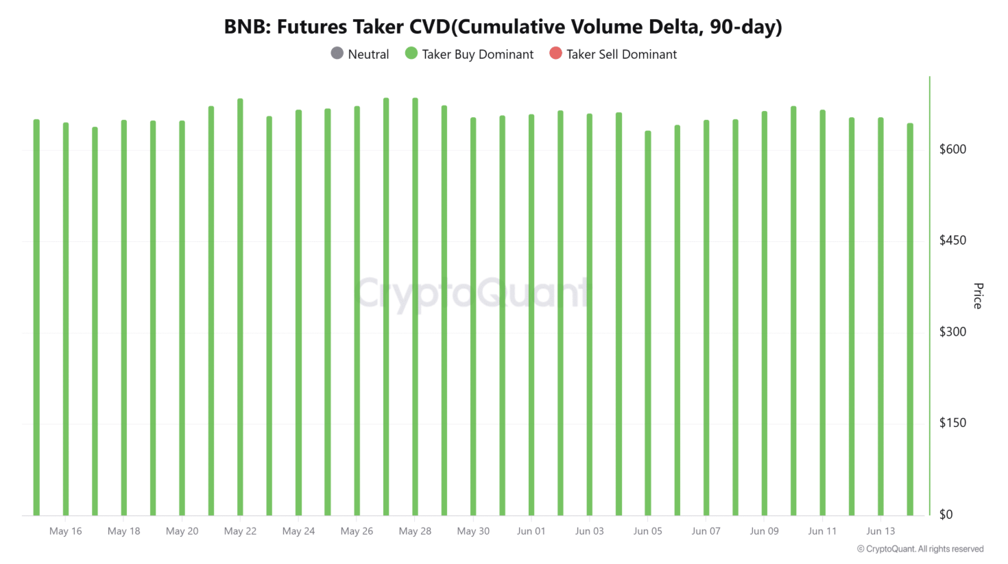 Hiện tại, phần lớn những người mới tham gia thị trường đều mang tâm thế tích cực và thuộc nhóm có tiềm lực tài chính mạnh. Bằng chứng rõ ràng là chỉ số CVD (Cumulative Volume Delta) trên thị trường hợp đồng tương lai BNB vẫn nghiêng hẳn về bên mua trong suốt 90 ngày qua, cho thấy phần lớn các lệnh taker đang đặt cược vào xu hướng tăng giá.