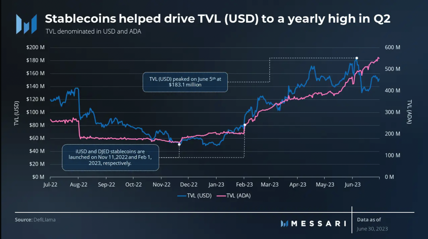 Các stablecoin đã thúc đẩy động thái giao dịch TVL và DApp này, tăng 34,9% theo quý — từ 10 triệu trong quý 1 lên 13,5 triệu đô la trong quý 2. Sự tăng trưởng hoạt động mạng sẽ làm tăng thêm áp lực cho ADA, có vai trò thanh toán phí và staking trong hệ sinh thái Cardano.