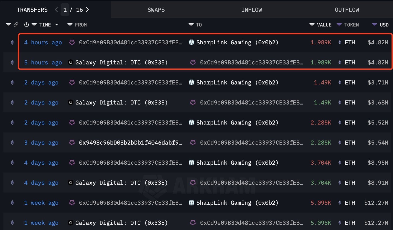 Mới đây, SharpLink Gaming đã thực hiện một giao dịch OTC quy mô lớn, mua thêm 1.989 ETH trị giá khoảng 4,82 triệu đô la chỉ trong vòng 5 giờ. Với động thái này, tổng lượng mà tổ chức đang nắm giữ đã tăng lên 190.467 ETH, tương đương gần 478 triệu đô la – bao gồm cả đợt mua 188.478 ETH trước đó.