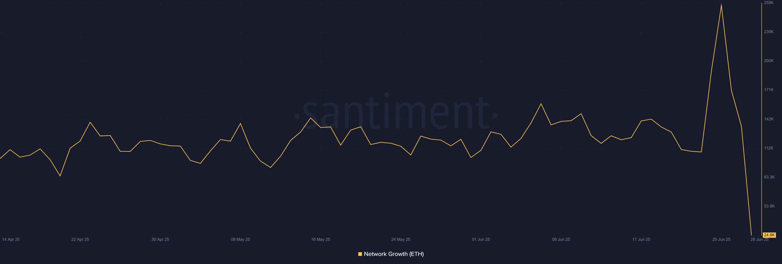 Chỉ số tăng trưởng mạng Ethereum đã nhảy vọt vượt 250.000 địa chỉ mới trong thời gian ngắn trước khi giảm trở lại 24.800, theo dữ liệu của Santiment.