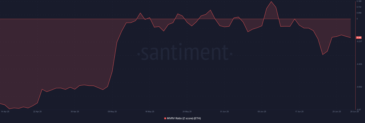 MVRV Z-score của Ethereum đã giảm xuống -0,18, cho thấy nhiều holder hiện đang thua lỗ.
