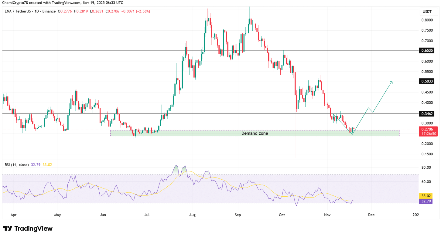 Dù vậy, ENA vẫn đang nằm dưới mức phản ứng quan trọng tại $0,3462. Đây là ngưỡng then chốt cần được xuyên thủng để xác nhận bất kỳ sự thay đổi động lượng nào. RSI đang ở mức 32 và dần hướng lên, cho thấy dấu hiệu ổn định sau pha điều chỉnh sâu từ vùng $0,5033.