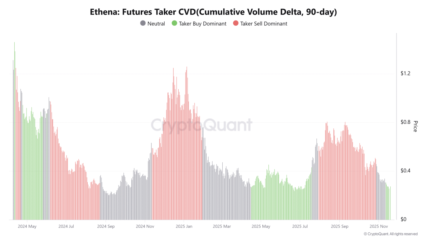 Diễn biến này hoàn toàn trùng khớp với phản ứng tại vùng cầu, nơi phe bò đang cố gắng thiết lập lại đà tăng mới. Ethena vì vậy đang mở rộng khả năng hồi phục khi dòng tiền từ phe bò chiếm ưu thế trong thị trường phái sinh.