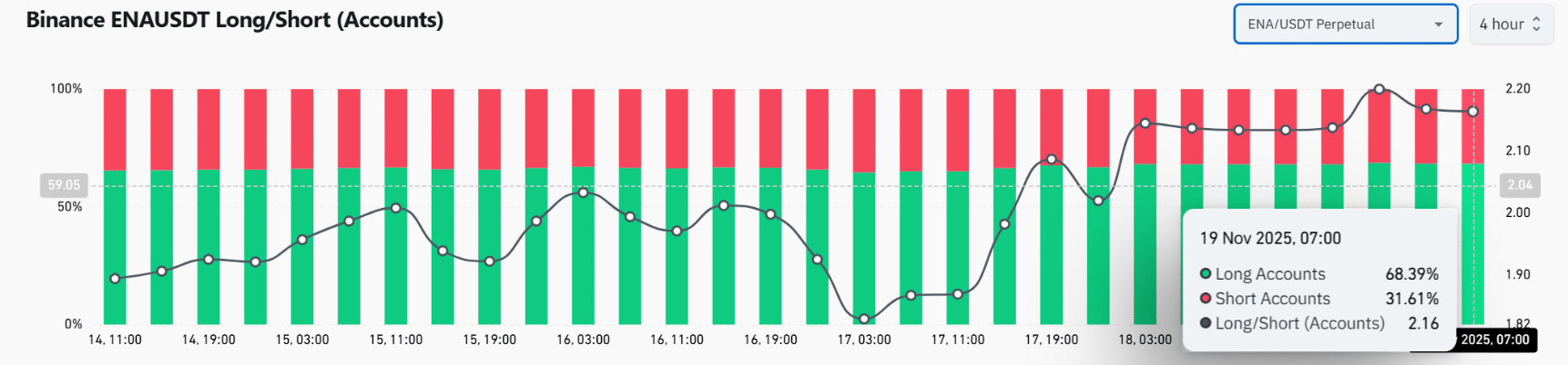 Tỷ lệ tài khoản Long trên Binance đã tăng lên 68,39%, đẩy chỉ số Long/Short lên 2,16 – cho thấy kỳ vọng rõ rệt về khả năng tiếp tục tăng giá từ vùng nén hiện tại của ENA. Tuy nhiên, mức đòn bẩy cao đồng nghĩa biến động mạnh hơn, khi thị trường thường “quét” cả hai phía trước khi xác lập xu hướng bền vững.