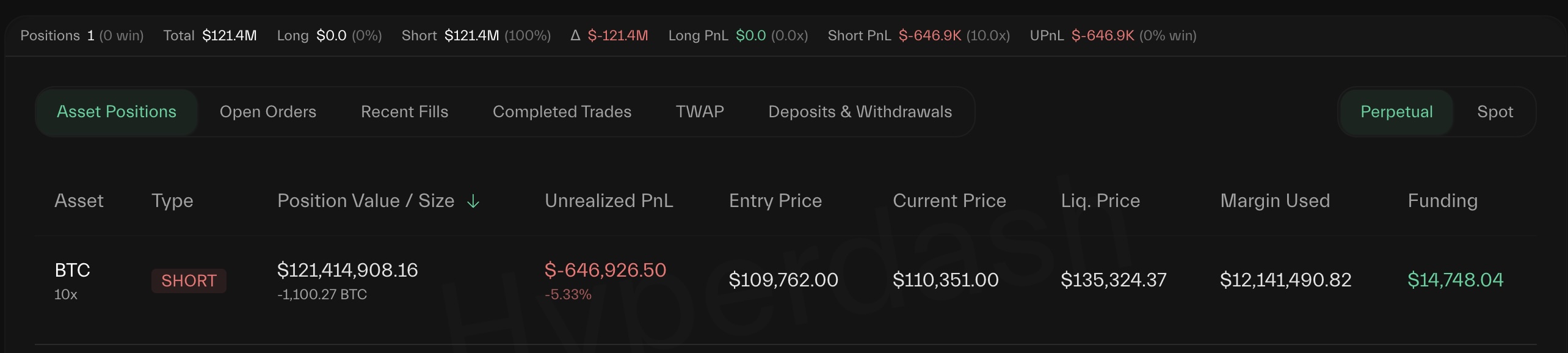 Khi Bitcoin giao dịch quanh 110.800 USD, động thái mở lại lệnh short trị giá 121 triệu USD cho thấy “Hyperliquid whale” đang quay lại với quan điểm bi quan, sau khi BTC hồi phục hai chữ số so với đầu tuần. Giới trader trên Hyperliquid đang chờ xem liệu đây sẽ là khởi đầu cho một cú đảo chiều lớn khác — hay là lần hiếm hoi cá voi này tính sai hướng.