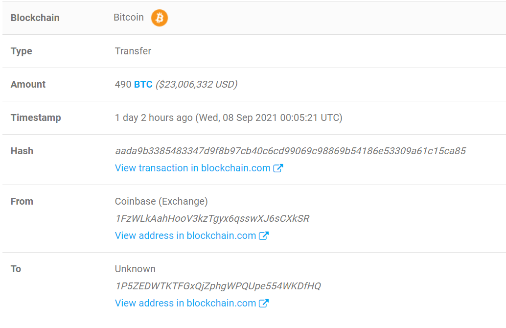 Cá voi lớn thứ ba bí ẩn đã mua 490 BTC với giá Bitcoin khoảng 46.800 đô la trong một giao dịch trị giá 23 triệu đô la. Thời điểm diễn ra giao dịch vào lúc 00:05 GMT ngày 8/9 và các coin này đã được chuyển từ sàn giao dịch Coinbase, theo báo cáo của WhaleAlert.