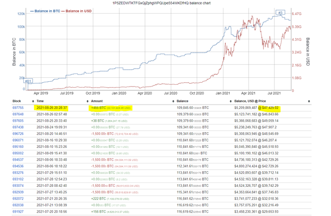 Cuối tháng 8, thực thể này cũng tích lũy thêm Bitcoin qua hai lần mua. Một trong số đó là 466 BTC ở mức 47.400 đô la. Lần khác là vào ngày 26/8 với một giao dịch khiêm tốn 38 BTC, tương đương khoảng 23 triệu đô la theo giá hiện hành. Tất cả các giao dịch được thực hiện từ ví Coinbase.
