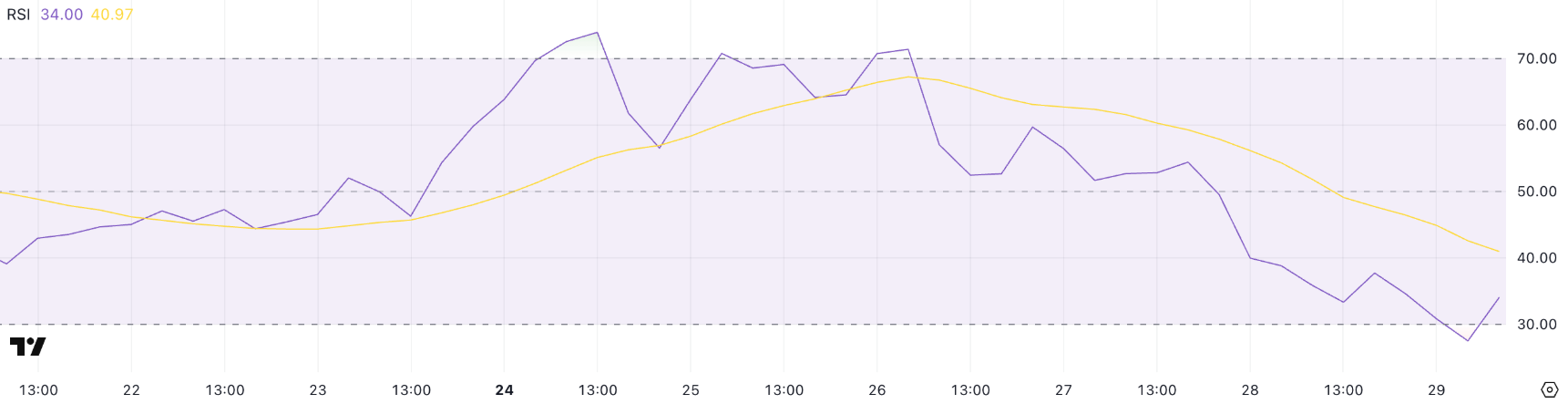 Chỉ số sức mạnh tương đối (RSI) của ONDO hiện ở mức 34, sau khi phục hồi nhẹ từ mức đáy 27,5 trước đó. Chỉ hai ngày trước, RSI vẫn ở mức 54,39, phản ánh sự thay đổi động lượng nhanh chóng trong ngắn hạn.