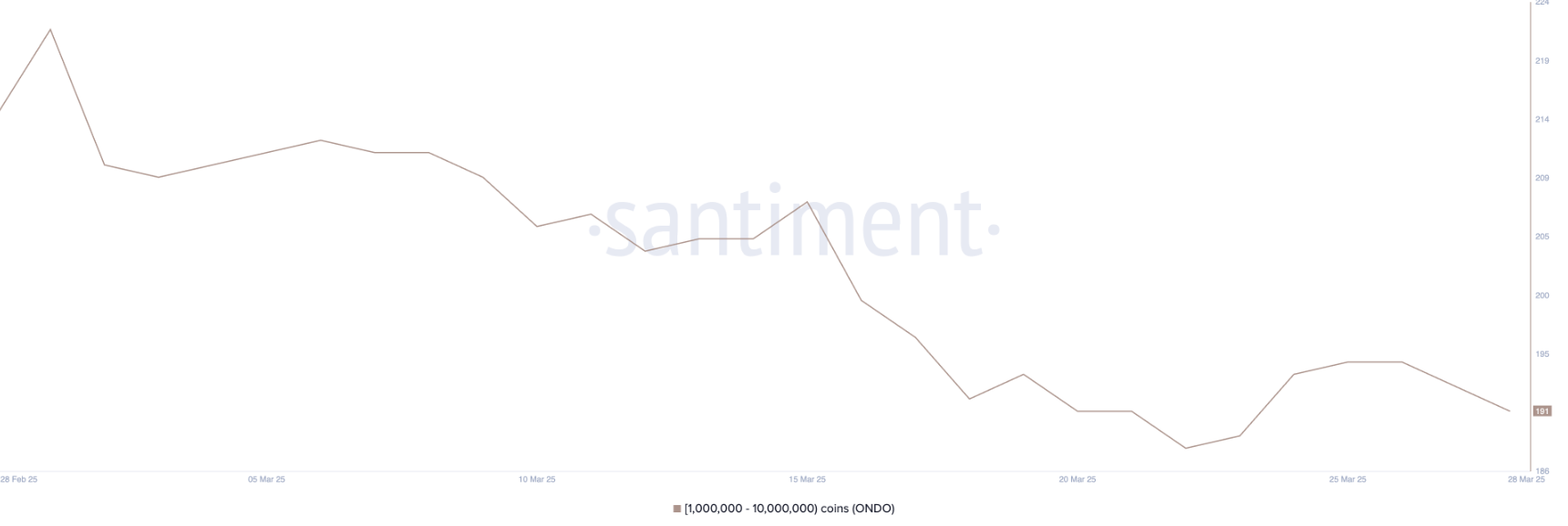 Số lượng cá voi ONDO (các địa chỉ sở hữu từ 1 triệu đến 10 triệu ONDO) đã có sự biến động vào cuối tháng 3. Ban đầu, con số này tăng từ 188 lên 195 trong giai đoạn từ ngày 22/3 đến 26/3, nhưng sau đó lại giảm xuống còn 191 trong những ngày gần đây.