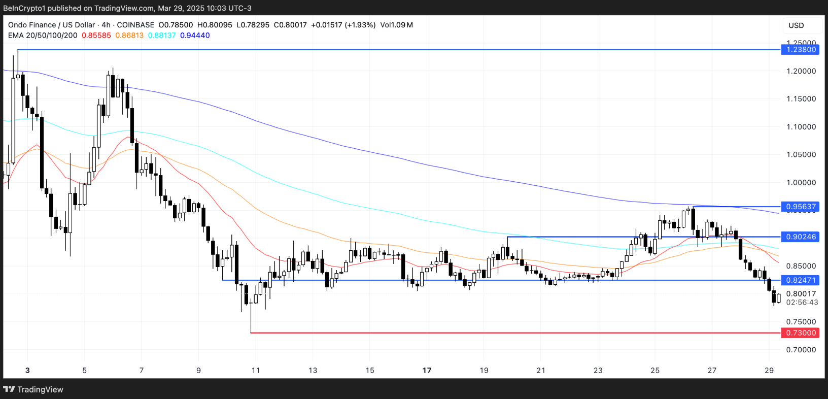 Các đường trung bình động hàm mũ (EMA) của ONDO hiện đang sắp xếp theo mô hình giảm giá, cho thấy xu hướng suy yếu có thể tiếp tục. Nếu đà giảm duy trì, ONDO có thể kiểm tra mức hỗ trợ quan trọng tại $0,73.