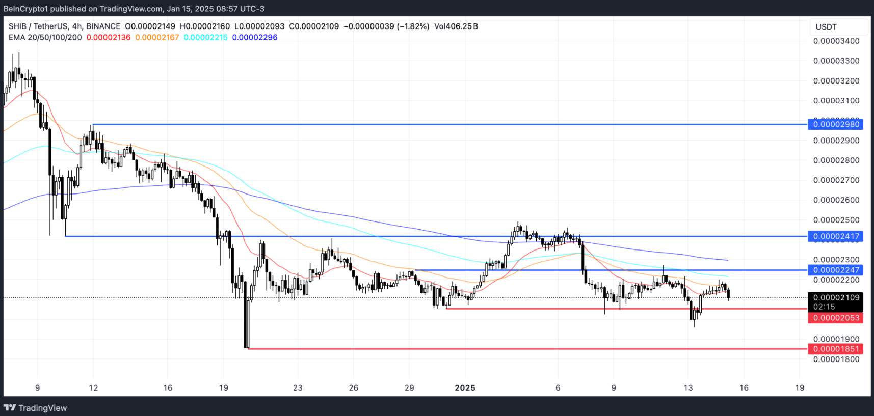 Biểu đồ giá cho thấy SHIB có ngưỡng hỗ trợ gần $0,0000205. Nếu mức này bị phá vỡ, giá có thể giảm xuống $0,0000185, tương đương mức điều chỉnh 11,9%.
