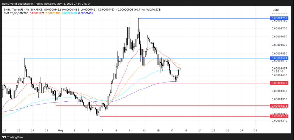 Shiba Inu (SHIB) hiện đang giao dịch trong phạm vi hẹp, đối mặt với ngưỡng kháng cự ở mức $0,0000152 và ngưỡng hỗ trợ tại $0,0000139. Các đường EMA của nó, trước đây cho thấy khả năng tăng giá mạnh, hiện đang đi ngang, cho thấy đà tăng đã yếu đi.