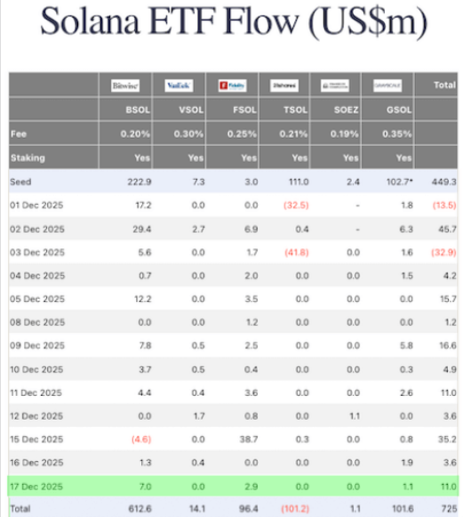 Các ETF Solana giao ngay ghi nhận dòng vốn ròng 11 triệu USD trong ngày 18/12, cho thấy nhu cầu từ khối tổ chức vẫn duy trì ổn định ngay cả khi giá giao ngay suy yếu. Những sản phẩm đầu tư này tiếp tục hấp thụ nguồn cung trên thị trường, đóng vai trò là lực đỡ quan trọng trong bối cảnh điều chỉnh.