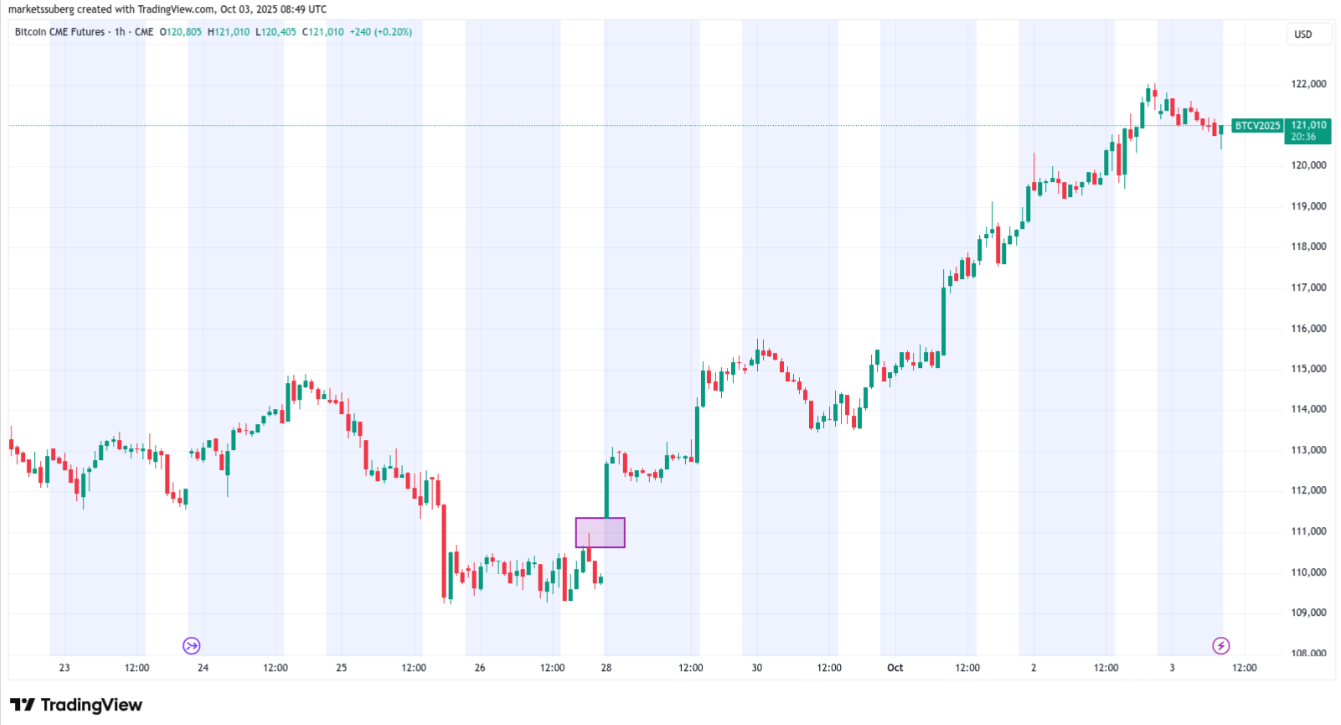 Điều đáng chú ý là chỉ ít ngày trước, thị trường hợp đồng tương lai lại gây chú ý bởi xu hướng ngược lại. Một “gap” cuối tuần trên hợp đồng tương lai Bitcoin của CME Group đã trở thành mục tiêu điều chỉnh ngắn hạn mới, nằm ngay phía trên mốc 110.000 USD, theo dữ liệu từ TradingView.
