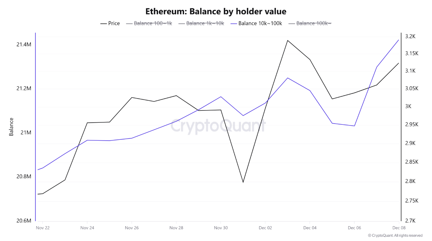 Dữ liệu từ CryptoQuant cho thấy các ví nắm giữ từ 10.000–100.000 ETH đã mua vào gần 400.000 ETH chỉ trong hai ngày Chủ Nhật và Thứ Hai. Đây là sự đảo chiều mạnh mẽ so với tuần trước, khi họ đã bán ra khoảng 220.000 ETH từ giữa tuần đến cuối tuần.