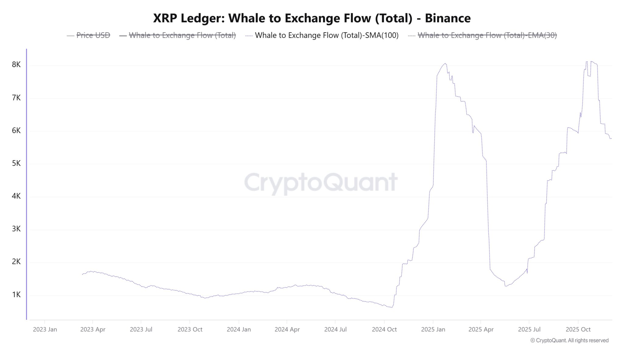 Đường SMA 100 ngày của chỉ báo Whale-to-Exchange Flow từ CryptoQuant đạt đỉnh ngày 6/11, cho thấy xu hướng phân phối kéo dài nhiều tháng, mang tính cấu trúc chứ không phải đột biến.