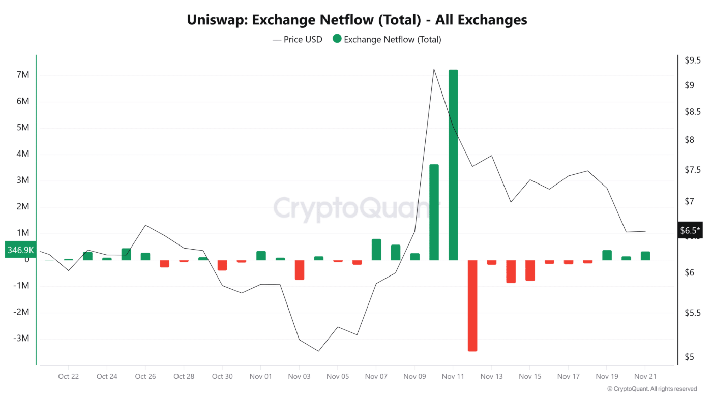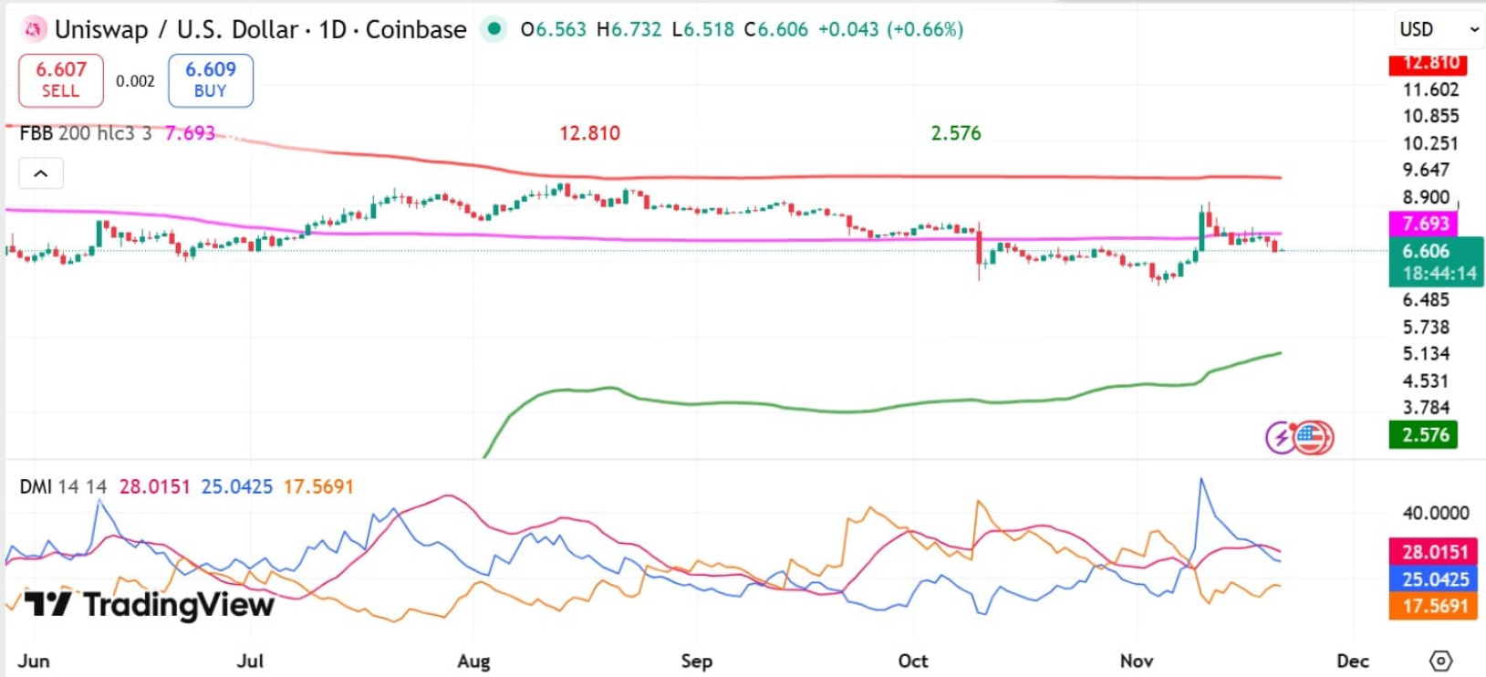 Với việc cá voi tiếp tục bán ra và tâm lý giảm giá chiếm ưu thế, UNI có nguy cơ phải đối mặt với nhiều nhịp điều chỉnh sâu hơn. Nếu xu hướng hiện tại kéo dài, giá có thể lùi về $5,8, qua đó xóa sạch toàn bộ mức tăng đạt được trong tháng 11.