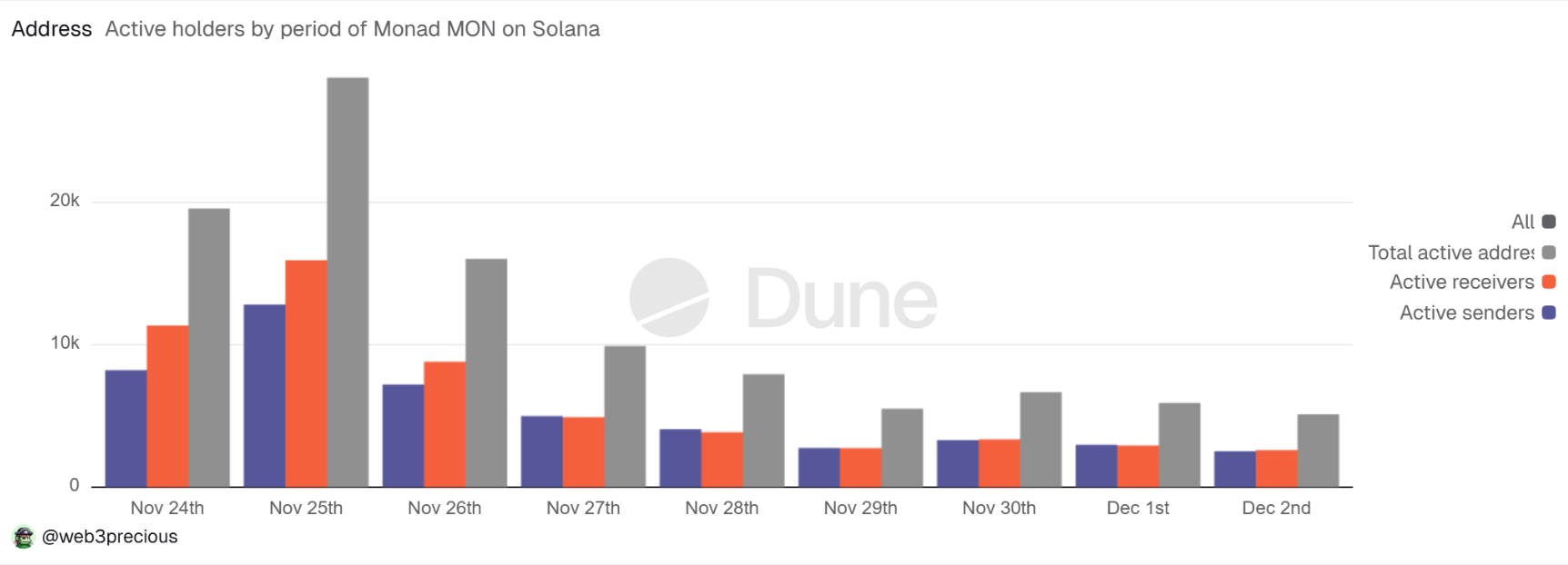 Hoạt động trên toàn mạng lưới Monad tiếp tục phát đi những tín hiệu thận trọng. Số lượng địa chỉ hoạt động đã suy giảm đều trong suốt tuần qua và gần như đi ngang trong vài ngày gần đây. Đây là nhóm địa chỉ đại diện cho những người dùng trực tiếp tương tác với blockchain thông qua các hoạt động gửi, nhận và thực hiện giao dịch.