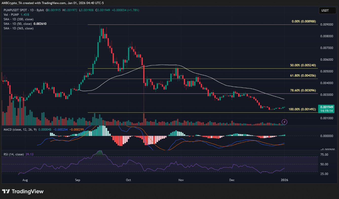 PUMP cũng ghi nhận mức tăng 16% trong “Santa rally”. Tuy nhiên, để xác nhận một xu hướng tăng bền vững, token này cần chinh phục lại đường trung bình động (MA) 50 ngày.