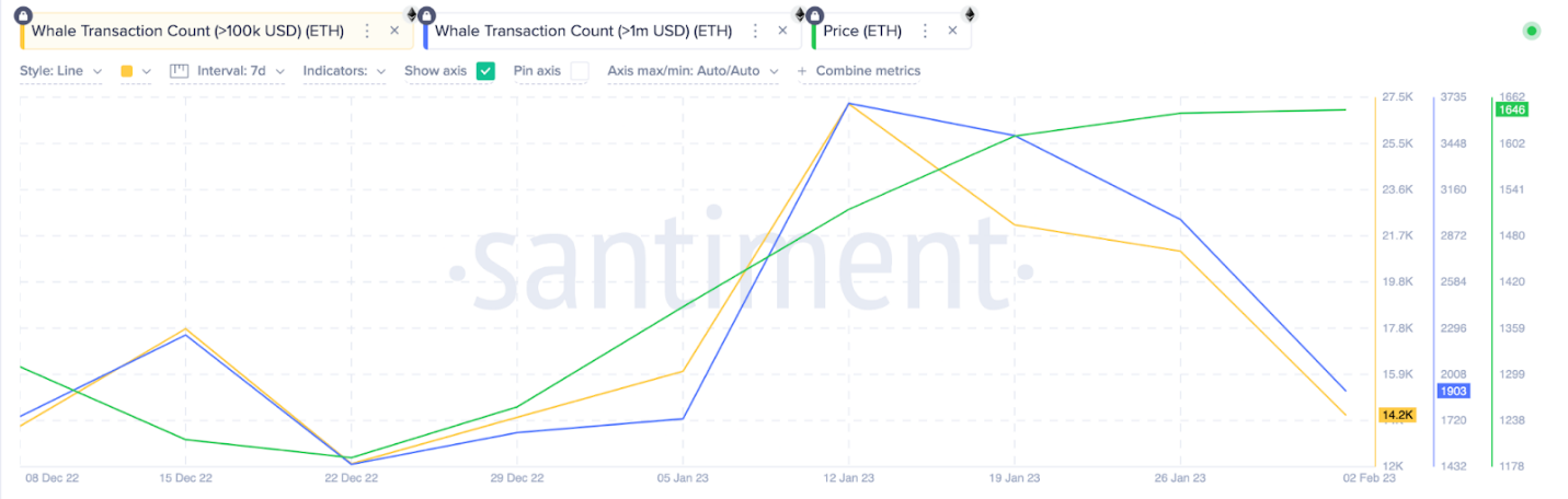 Biểu đồ giá ETH và giao dịch cá voi vào tháng 2/2023 | Nguồn: Santiment