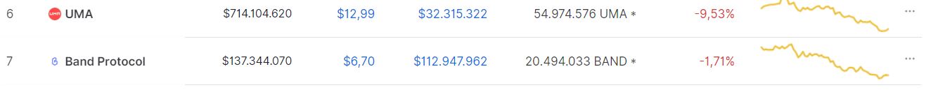 UMA, BAND, trong số những đồng tiền khác, giảm 1-10% trong 24 giờ qua. Điều này xảy ra bất chấp sức mạnh to lớn trong xu hướng của ETH như đã nói ở trên.