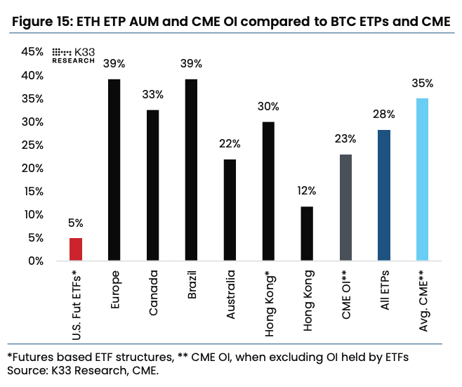 Trên toàn cầu, các ETP Ethereum hiện tại giữ 28,2% tài sản quản lý so với các ETP Bitcoin tương đương, loại trừ các ETF Bitcoin giao ngay của Hoa Kỳ. Ở Canada và châu Âu, con số đó khoảng 33%.