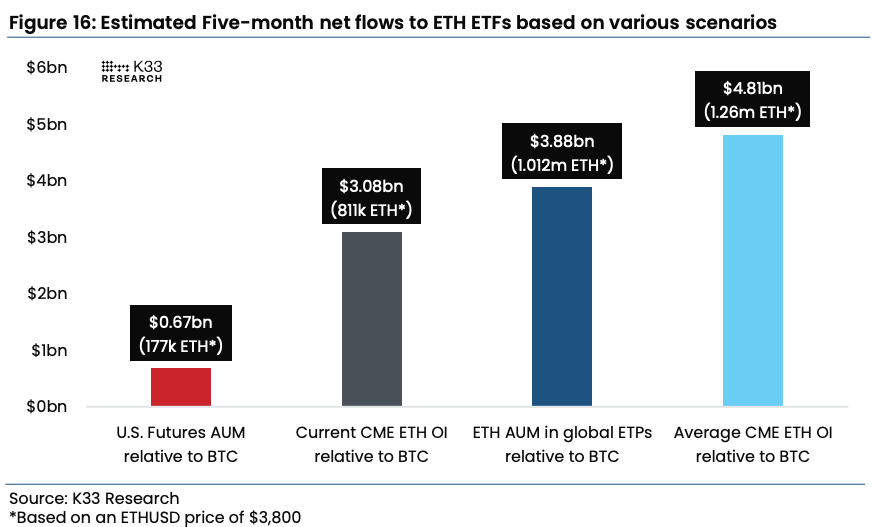 Áp dụng các trọng số từ các thị trường tương đương đó vào tổng dòng vốn ròng $14 tỷ của ETF Bitcoin giao ngay kể từ khi ra mắt vào tháng 1, ước tính của K33 cho thấy các ETF Ethereum giao ngay có thể tích lũy từ 800.000 ETH đến 1,26 triệu ETH trong năm tháng đầu tiên — tương đương từ 0,7% đến 1,05% nguồn cung Ether lưu thông.