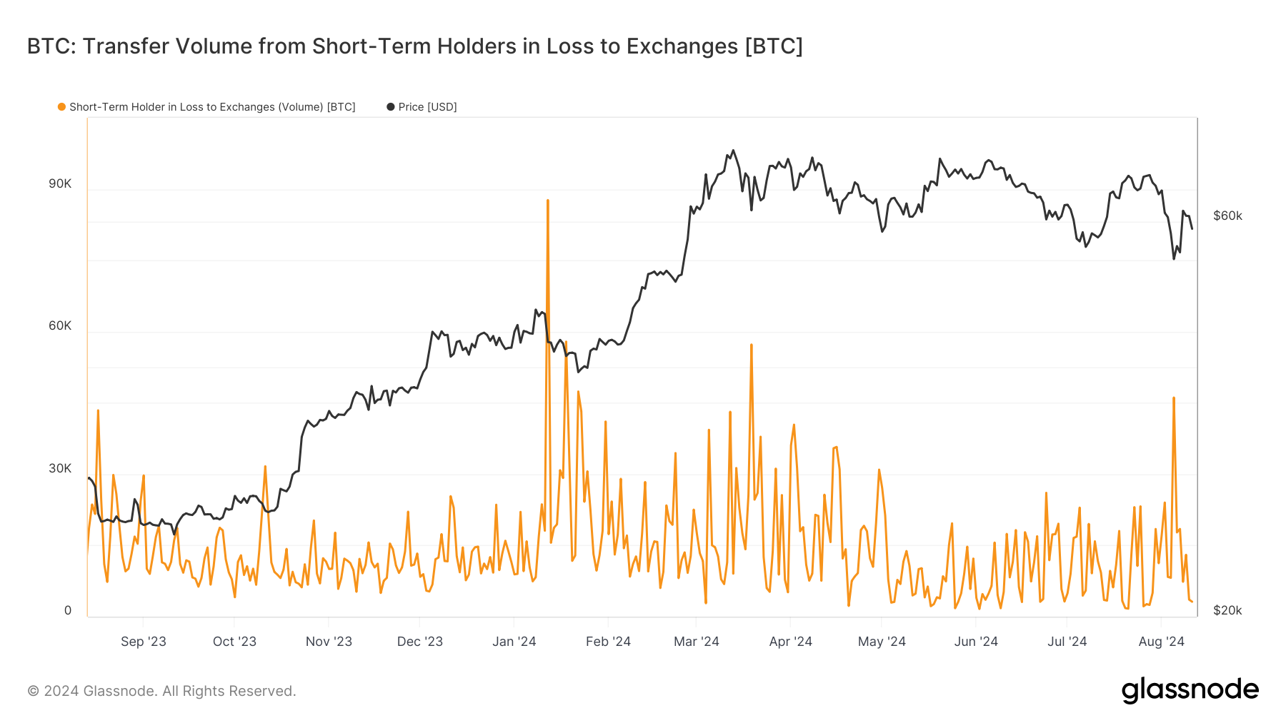 Việc Bitcoin giảm xuống $49.000 vào ngày 5 tháng 8 đã khiến gần 50.000 BTC được gửi lên các sàn giao dịch ở trạng thái lỗ, đánh dấu con số cao nhất trong một ngày kể từ tháng 3 khi Bitcoin giảm từ mức cao nhất mọi thời đại và là con số cao thứ năm trong năm nay. Điều này cho thấy rằng nếu Bitcoin tiếp tục giảm, rủi ro từ áp lực bán có thể gia tăng khi nhiều holder có thể buộc phải thanh lý tài sản của mình.
