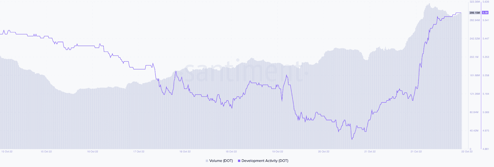 Quan sát biểu đồ bên dưới, khối lượng của Polkadot cao hơn đáng kể trong tuần qua. Song song đó, mạng cũng ghi nhận hoạt động phát triển tốt hơn.