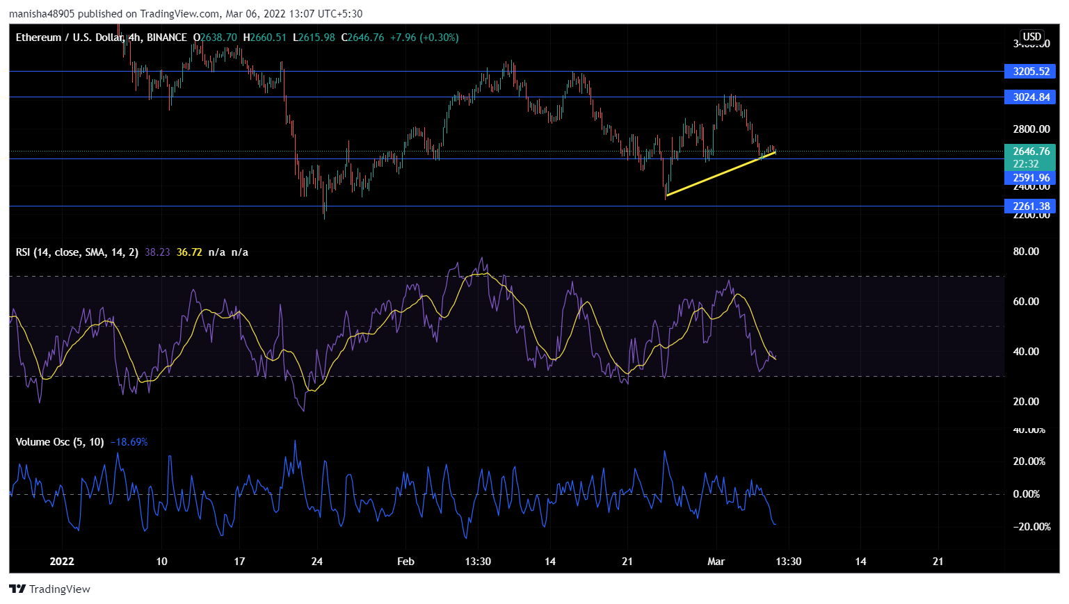 Tại thời điểm viết bài, ETH giảm gần 5% trong 24 giờ qua và giao dịch tại mức 2.538 đô la. Sau đợt bán tháo chưa từng có vào ngày 24/2, bò ETH đã tăng lượng tiếp xúc để đẩy giá lên trên biểu đồ. Tuy đạt đỉnh cục bộ tại 3.024 đô la nhưng altcoin lớn nhất đã vô hiệu đà tăng khi trượt về mức hỗ trợ kéo dài một tuần tại 2.591 đô la. Như vậy, để giá chạm đến 3.500 đô la, bò sẽ phải vượt qua ngưỡng kháng cự 3.024 và 3.205 đô la.