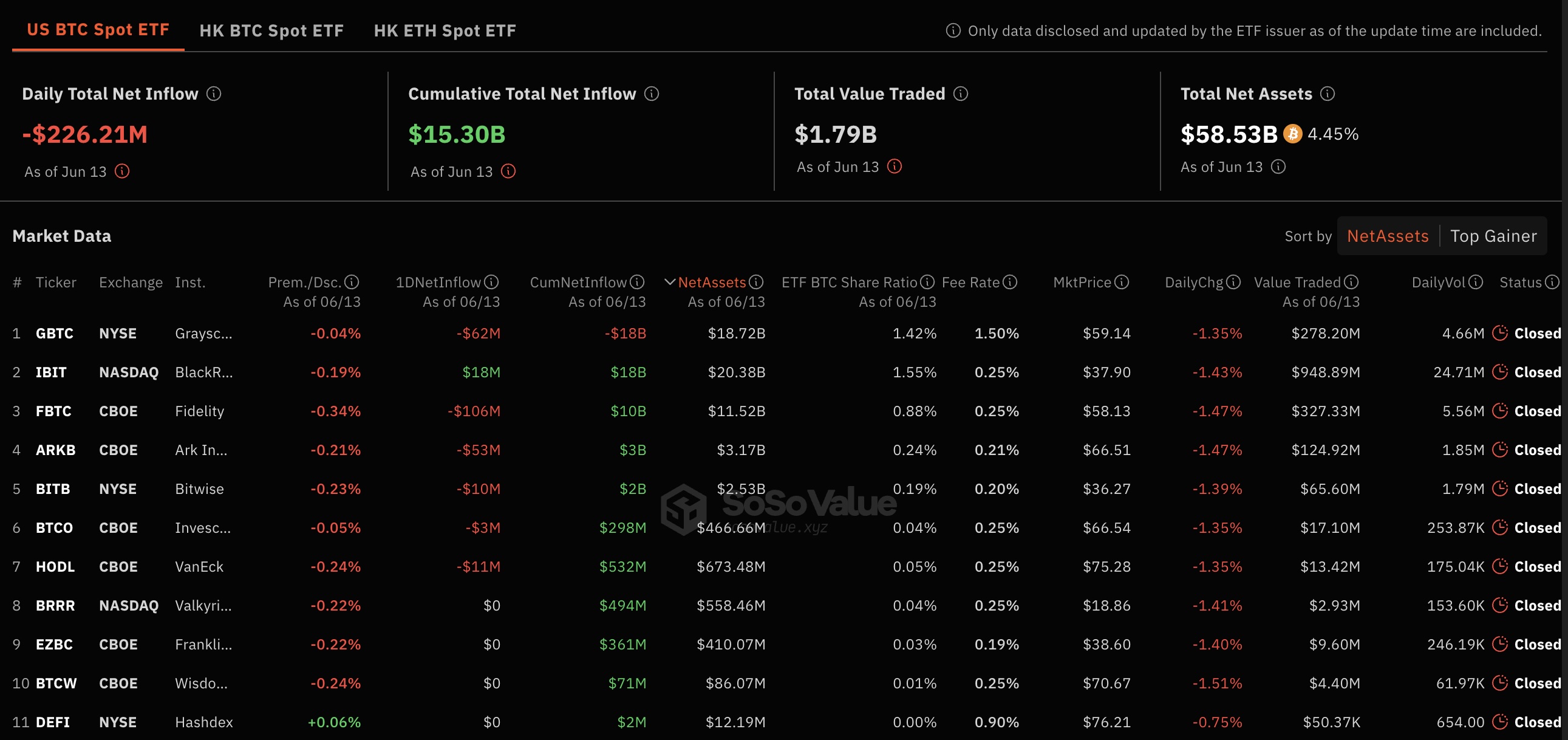 11 quỹ ETF Bitcoin giao ngay tại Hoa Kỳ đã báo cáo dòng tiền ra ròng lớn với tổng giá trị 226,21 triệu USD vào ngày hôm qua.