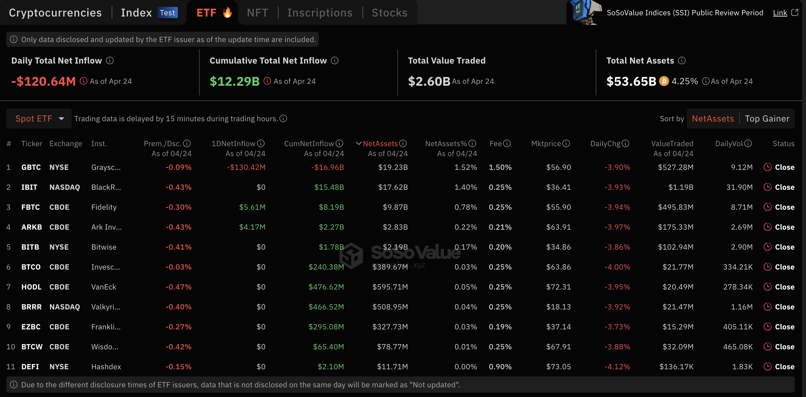 Theo dữ liệu từ SoSoValue, các quỹ ETF bitcoin giao ngay của Hoa Kỳ đã chứng kiến tổng dòng tiền ra ròng hàng ngày là 120,64 triệu USD vào thứ tư khi 8 sản phẩm được ghi nhận không có dòng tiền vào nào.