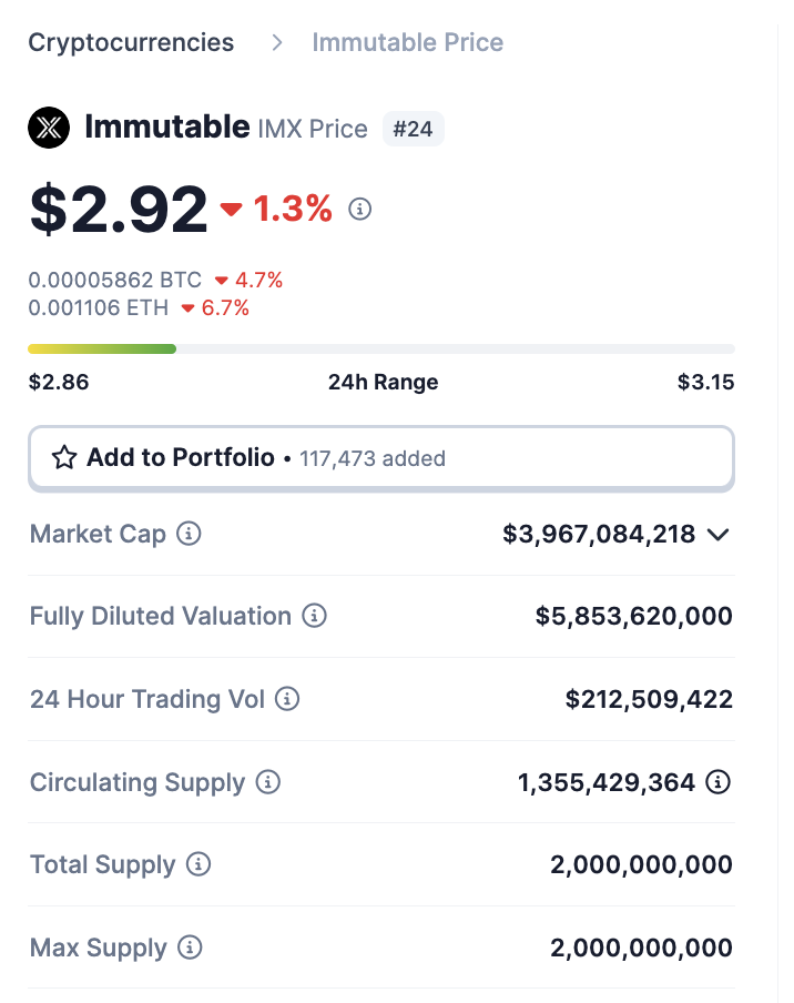 Đó là mức giá cao nhất mà IMX đã đánh dấu kể từ tháng 2 năm 2022, theo dữ liệu từ CoinGecko và mức giá hiện tại thể hiện mức tăng 37% trong bảy ngày qua. Nó cũng đẩy Immutable vào top 25 loại tiền điện tử hàng đầu tính theo vốn hóa thị trường, khiến nó trở thành token game duy nhất lọt vào top những đồng tiền ưu tú đó.