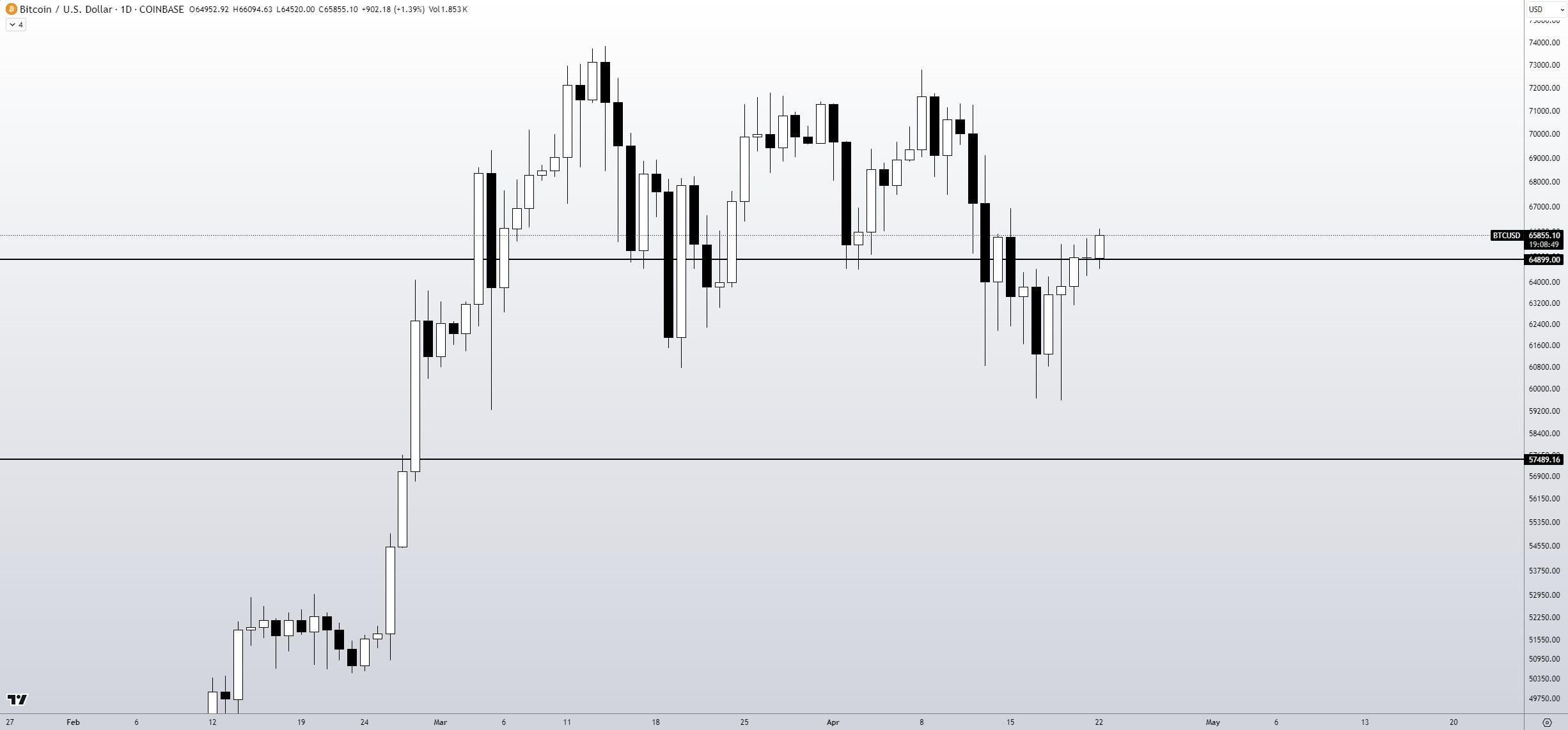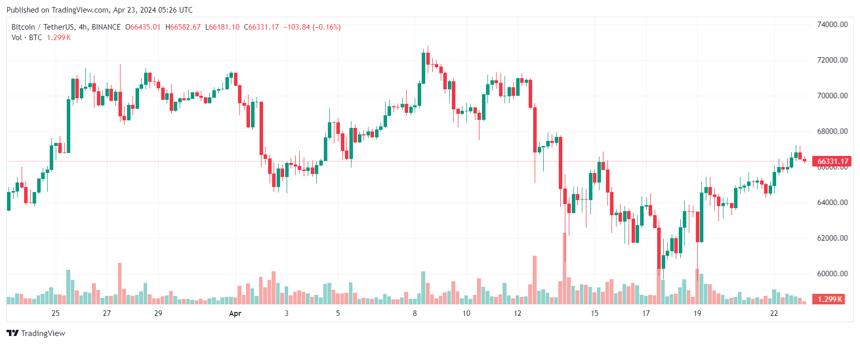 Bitcoin đã thiết lập mức đóng hàng ngày cao nhất trong hơn 10 ngày vào 21/4, lấy lại ngưỡng 65.000 đô la. Theo đó, giá BTC tăng 3,5% từ mức thấp 64.346 đô la vào ngày 21/4 lên mức cao nhất trong ngày là 66.527 đô la vào ngày 22/4.