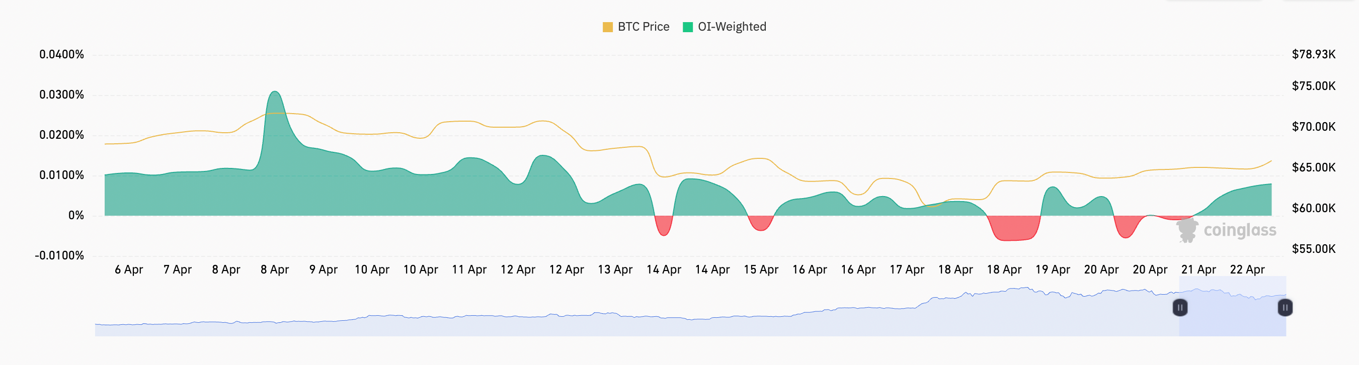 Dữ liệu từ Coinglass tiết lộ rằng funding rate hợp đồng mở (OI) của Bitcoin chuyển sang âm vào ngày 18/4 và một lần nữa vào ngày 21/4. Số liệu hiện đã trở lại vùng dương và dừng ở mức 0,0079% vào ngày 22/4, cho thấy nhu cầu các vị thế Long ngày càng tăng.