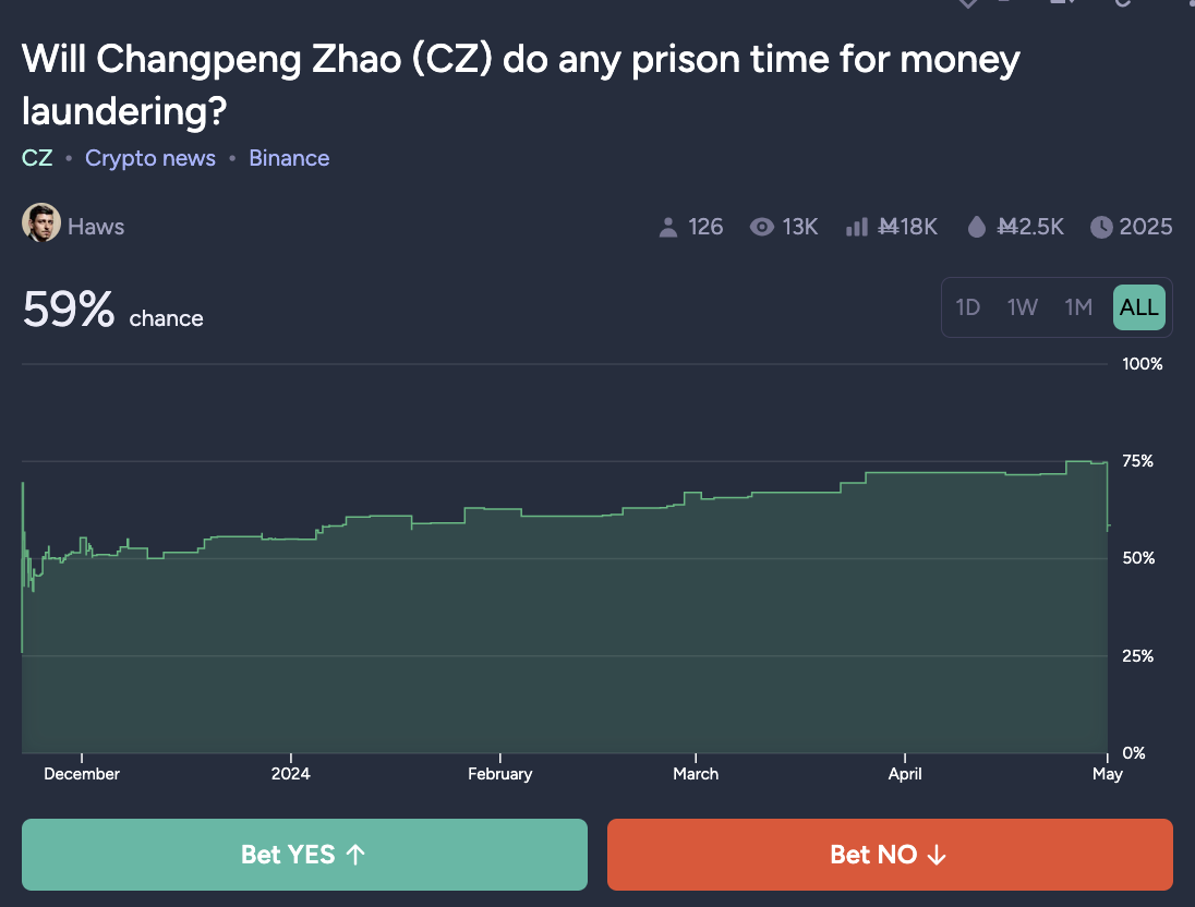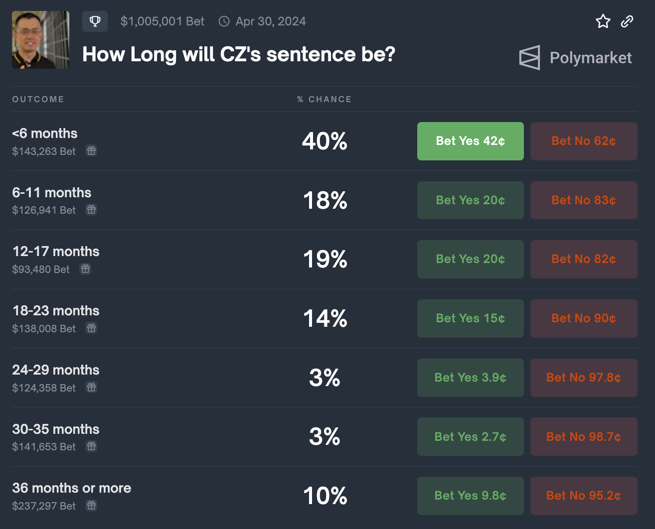 Phần lớn những người đặt cược trên nền tảng cá cược Polymarket cho rằng CZ sẽ không phải ngồi tù quá lâu.
