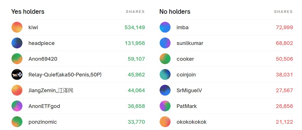 Một trong những holder hàng đầu với biệt danh “kiwi” nắm giữ lượng phiếu “Có” trị giá $ 421.000. Mặt khác, holder giữ số phiếu “Không” cao nhất chỉ ở mức $ 15.000.