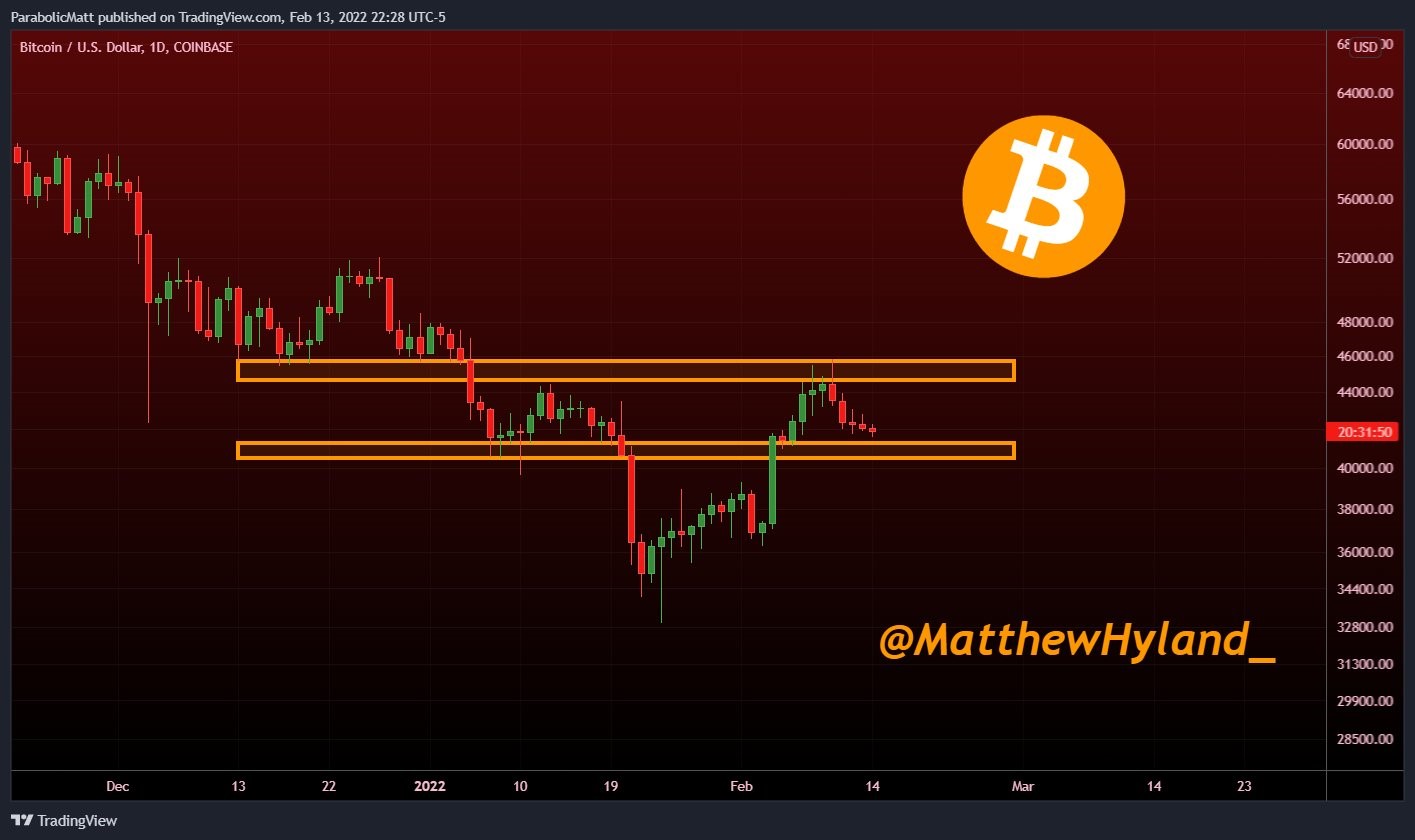 Nhà bình luận nổi tiếng Matthew Hyland đã tóm tắt vào thứ 2 rằng “Bitcoin đang ở giữa kháng cự, hỗ trợ” và anh cảm thấy “thư giãn” khi đối mặt với những biến động giá hiện tại.