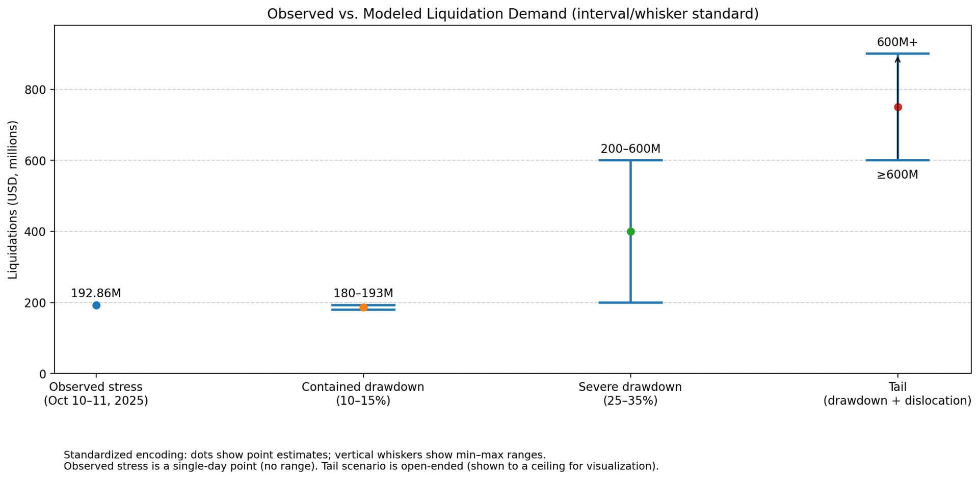 Biên độ chênh lệch giá mở rộng, thanh khoản mỏng hơn. Thanh lý có thể đạt 200–600 triệu USD trong giai đoạn cao điểm. Rủi ro lây lan phụ thuộc việc bán cưỡng bức có đẩy giá tài sản thế chấp xuống đủ mạnh để kích hoạt thanh lý dây chuyền trên các giao thức khác hay không. Khi thanh lý tập trung ở một nơi như Aave, tác động giá có thể lan nhanh hơn so với thị trường phân mảnh.