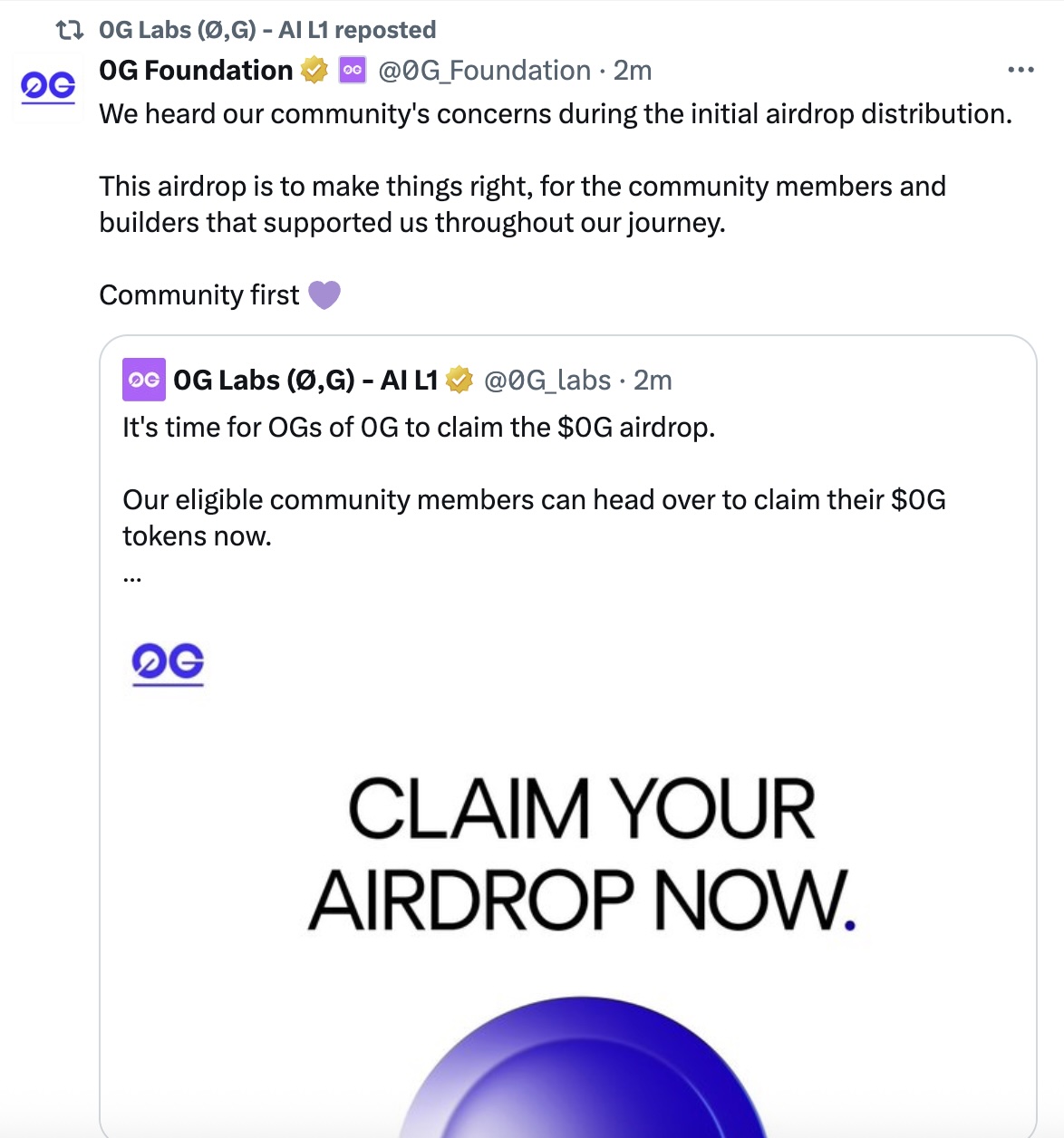 Tài khoản Xchính thức của 0G Labs bị hack cách đây ít phút, dẫn đến việc phát tán các liên kết đáng ngờ, cho claim airdrop. Người dùng X thận trọng và không nhấp vào bất kỳ link phishing tiềm ẩn nào.